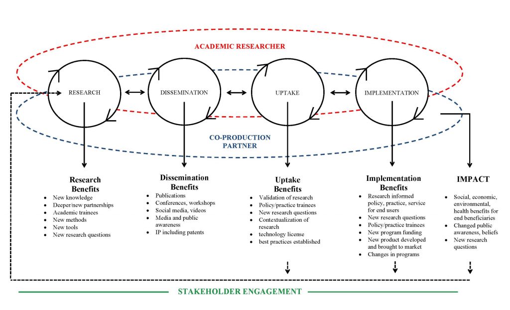 - Stakeholder engagement: Julie and I are both embedded in the impact systems of UK and Canada respectively. We routinely engage with people and organizations active in research impact. We understand the opportunities and the pain points and how they are different in countries like UK that has a formal impact assessment system (the Research Excellence Framework) and countries like Canada that don’t.