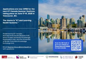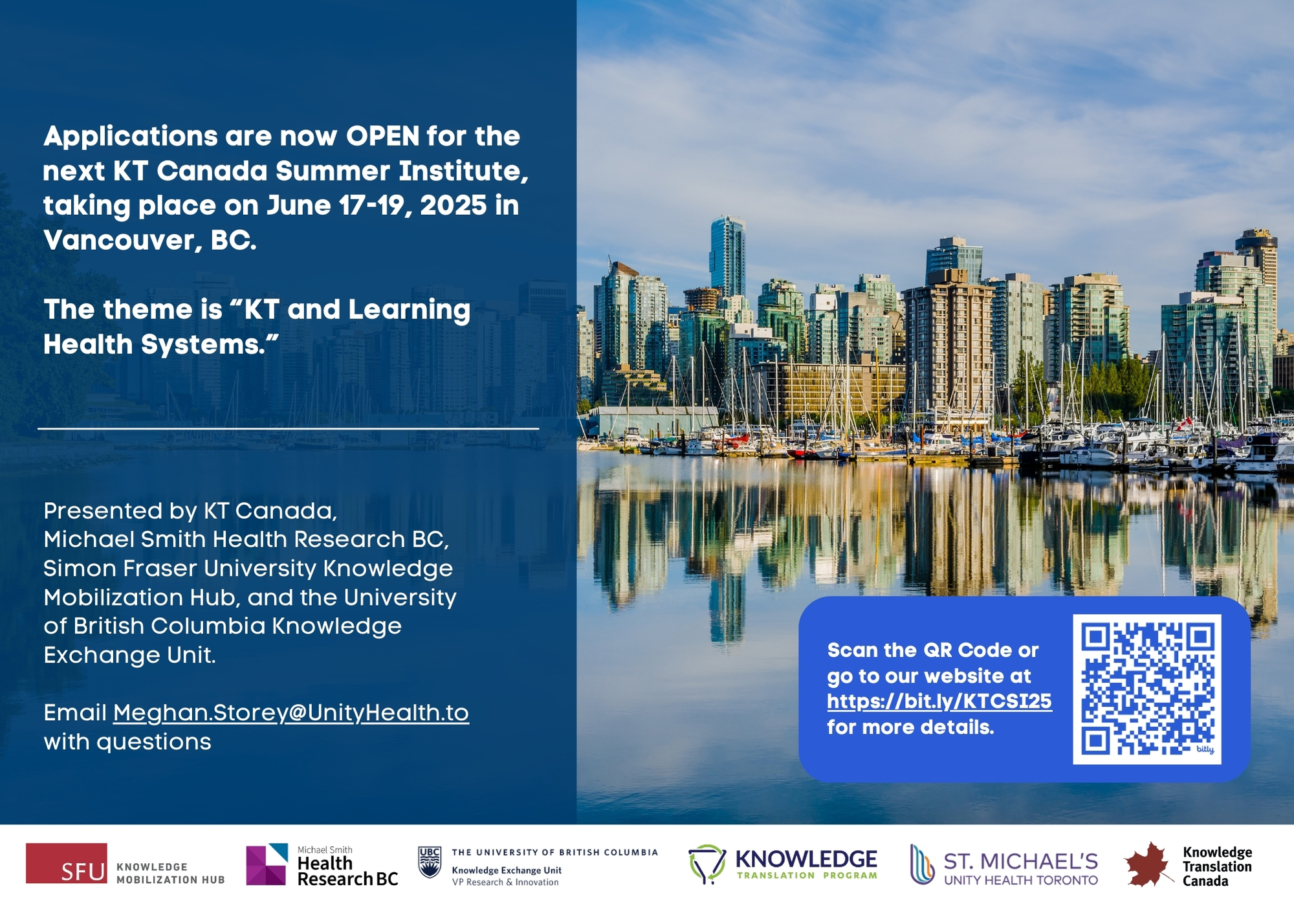 The next KT Canada Summer Institute will take place from June 17-19, 2025 in Vancouver, British Columbia. This will be an in-person event. The theme is “KT and Learning Health Systems.”